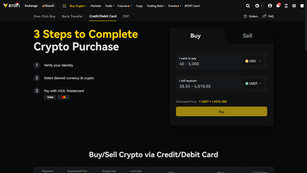 BYDFi支持四种主要加密货币购买入金渠道,其中特定方式适用零费率条件: