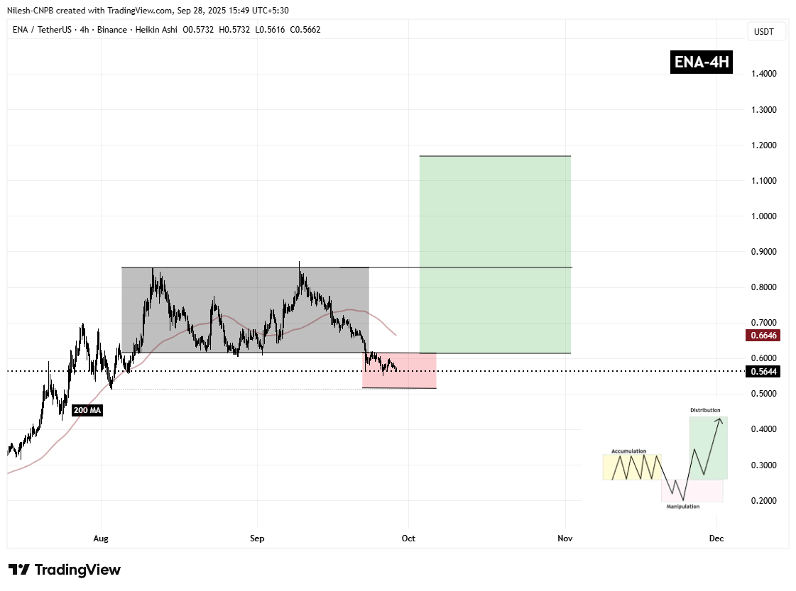 9月22日ENA跌破0.6175美元支撑后,目前交投于0.5640美元区域。这个红色标注区域反映市场操纵阶段,假突破往往会清洗立场不坚定的持仓者,随后市场才会转向上行。