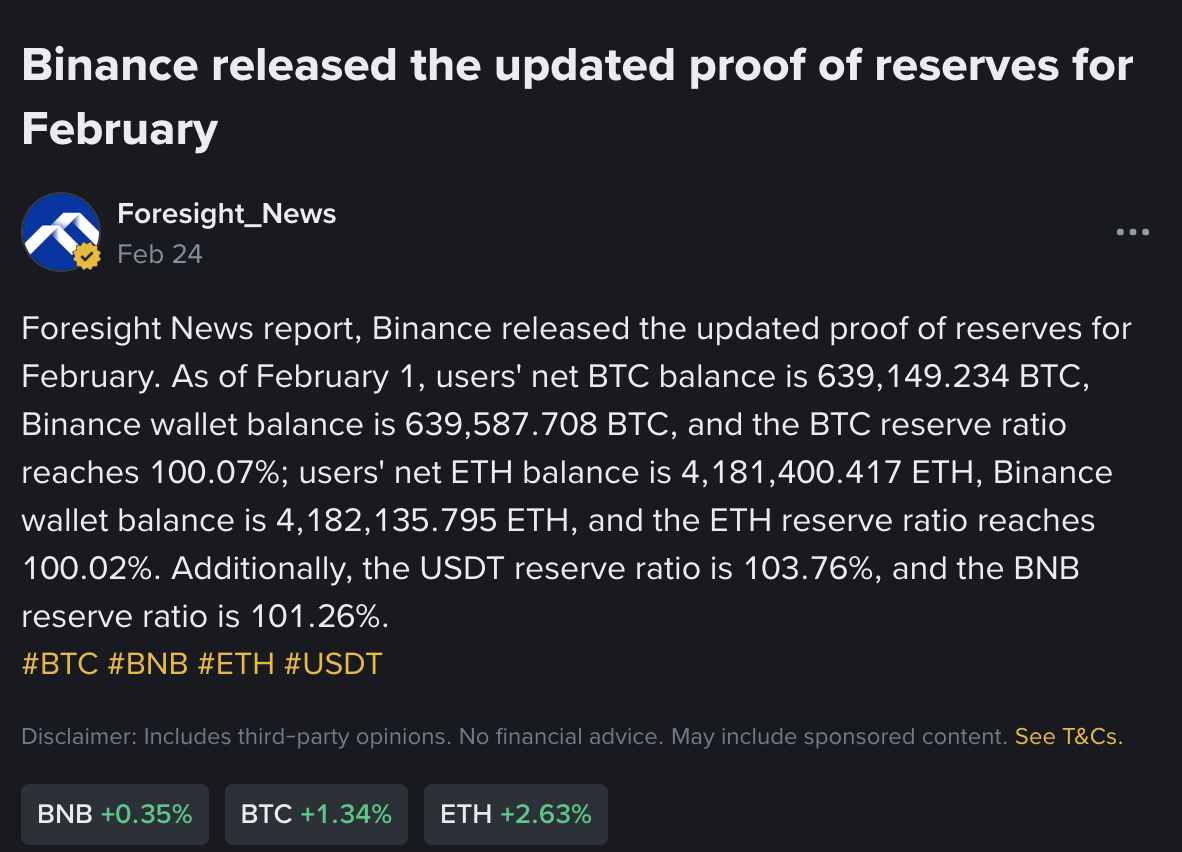 随着行业竞争重点转向透明度与财务责任,大型交易平台的储备披露正日益常态化。本月初,币安报告其比特币储备率达100.07%,钱包持仓量略高于用户总余额。该平台同时披露以太坊储备率为100.02%,泰达币为103.76%,BNB为101.26%。