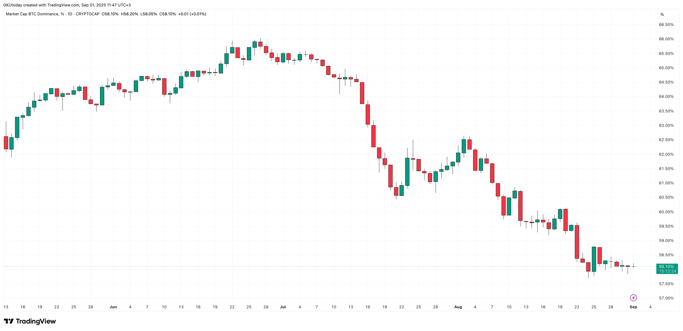 八月的市场表现展示了ETF资金流向如何周周变化,而主导趋势仍持续偏向比特币。4.4亿美元的流入使比特币保持领先,但58%的主导率清楚地表明,山寨币仍在抢占市场份额。
