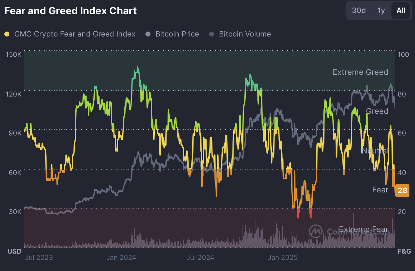 中美贸易摩擦升级促使交易者将约194亿美元资金转入稳定币,导致加密市场流动性缩减。加密货币恐惧与贪婪指数骤降至28("极度恐惧"),凸显当前情绪驱动的抛售潮。