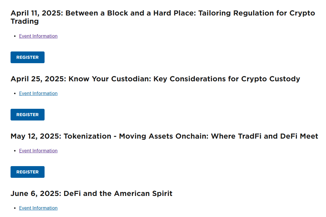 "证券交易委员会加密货币工作组将举行四次圆桌讨论,探讨正在进行的加密货币资产监管。每次圆桌会议的日期和主题如下: