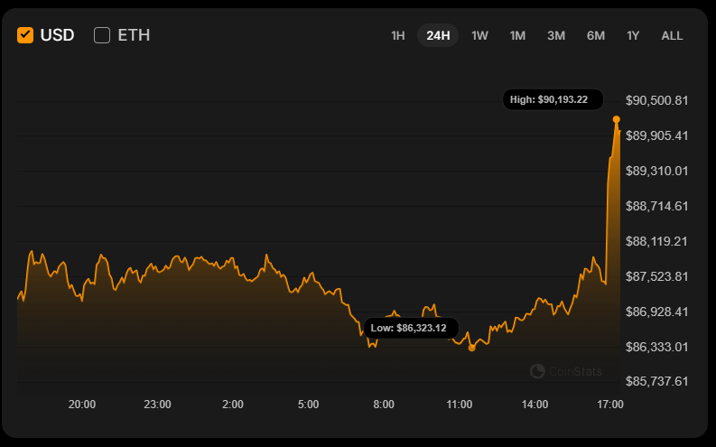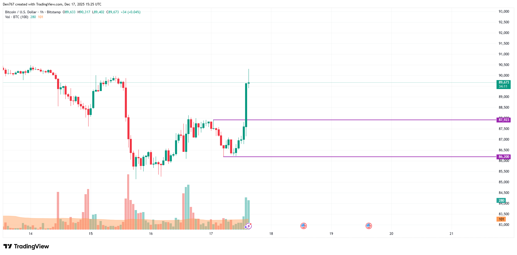 从小时线观察,BTC在突破局部阻力位后持续走高。成交量同步放大,表明目前多头掌控着市场主动权。若明日行情走势保持不变,本轮上涨或将触及92,000美元关口。
