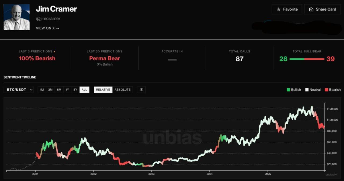 CNBC主持人吉姆·克莱默近期对比特币发表强烈看空言论后,加密圈部分人士将其视为反向操作信号。第三方追踪平台Unbias的记录显示,克莱默近期与比特币相关的表态明显倾向悲观,但交易社区认为这反而可能对比特币有利。