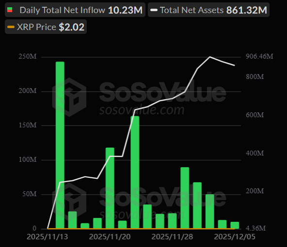 近期XRP ETF管理的总净资产突破8.61亿美元。这一成就令人印象深刻,要知道11月中旬时其总净资产还不足2.5亿美元。