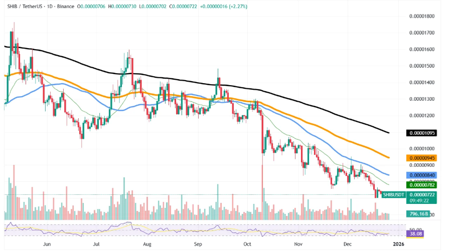 尽管交易所活动出现变化,SHIB价格仍处于关键移动平均线下方,并处于更广泛的下跌趋势中。然而下跌趋势的斜率已明显趋缓。市场正显现出企稳迹象,而非双向加速波动。