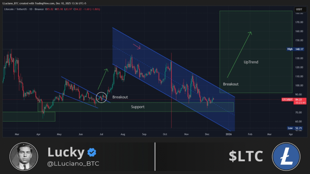加密货币分析师Crypto Tony指出,84.75美元水平对莱特币未来走向至关重要。他强调若价格持续低于该阻力位,可能会进一步下探至82.00美元支撑位。根据Tony的分析,莱特币当前价格走势表明其正处于转折点,突破或回调都将决定短期走势。