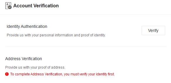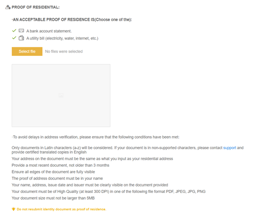 从这里,您可以通过提交居住证明文件完成地址验证过程。可接受的证明文件包括银行账户对账单和各种公用事业账单。