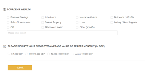 接下来,您可以输入财富来源和预期月交易金额,并通过点击“提交”按钮完成流程。