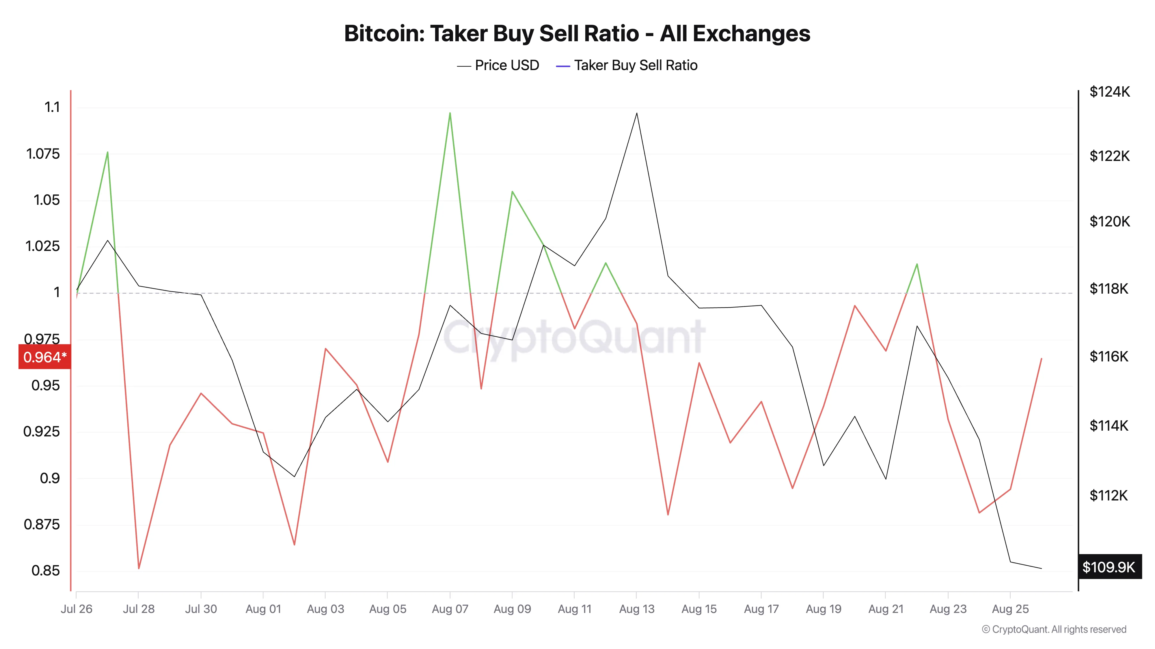 链上数据显示,比特币面临跌破11万美元心理关口的风险。最具说服力的指标之一是BTC的吃单买卖比率,该指标自7月以来持续呈现负值。根据CryptoQuant数据,当前比率为0.96,表明该币种市场整体呈现卖单主导态势。