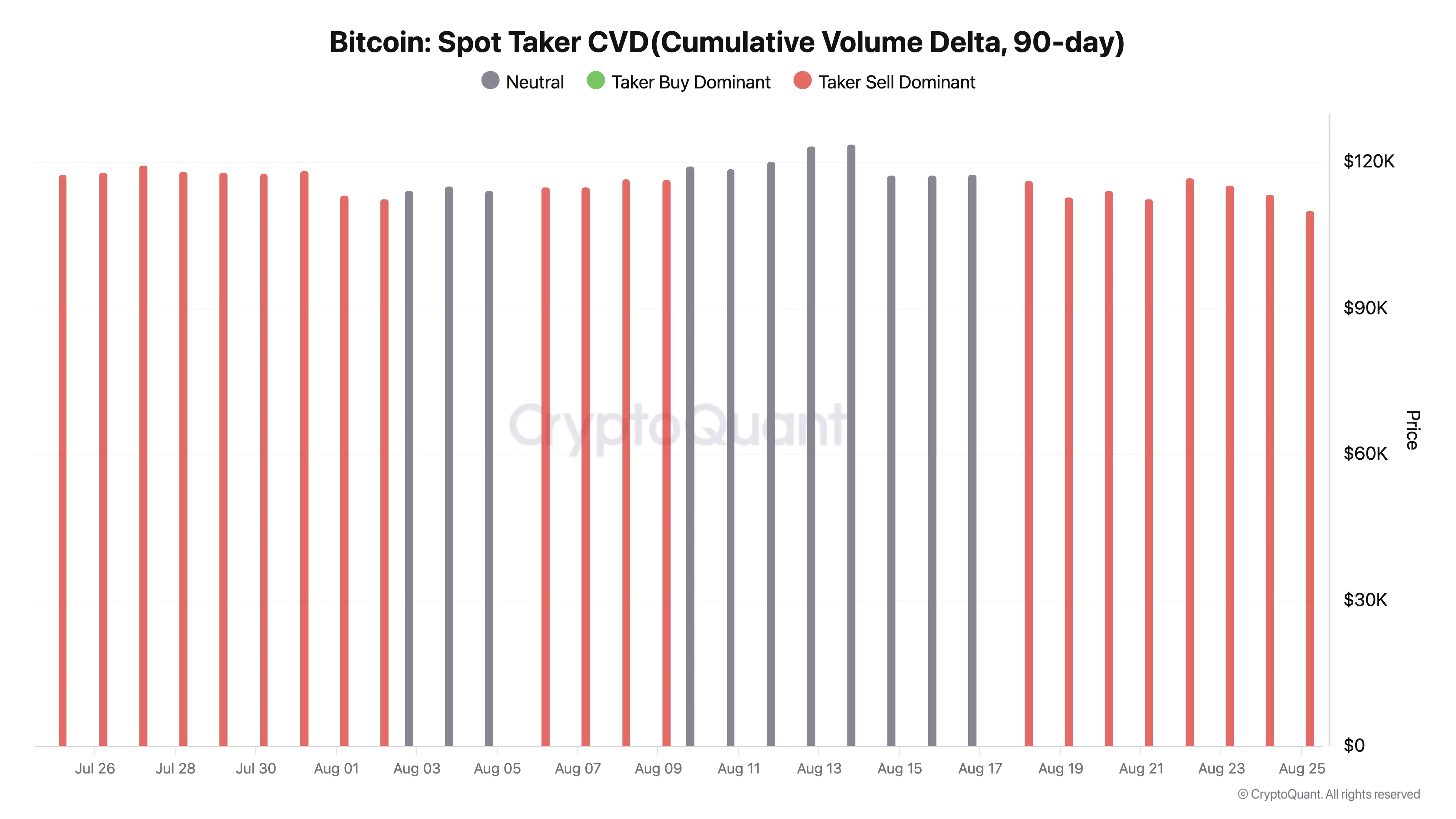 现货市场参与者的表现同样疲软。CryptoQuant数据显示,比特币现货吃单CVD(90日累计成交量差值)指标在8月18日从"中性"转为负值。此后该指标持续下行,表明卖方主导着现货市场活动。