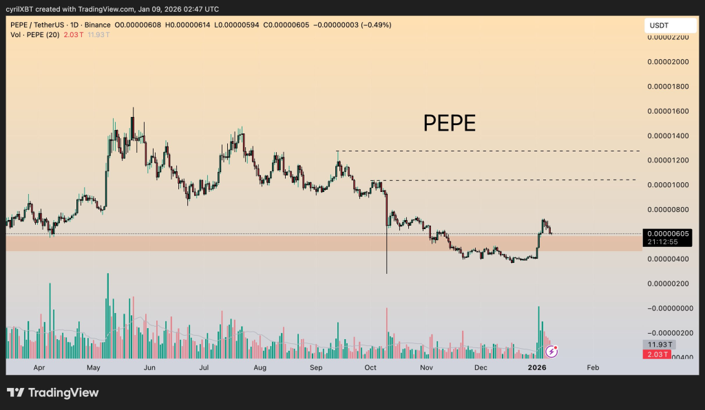 关键洞察:PEPE从关键需求区反弹,显示市场活动持续且复苏潜力显现