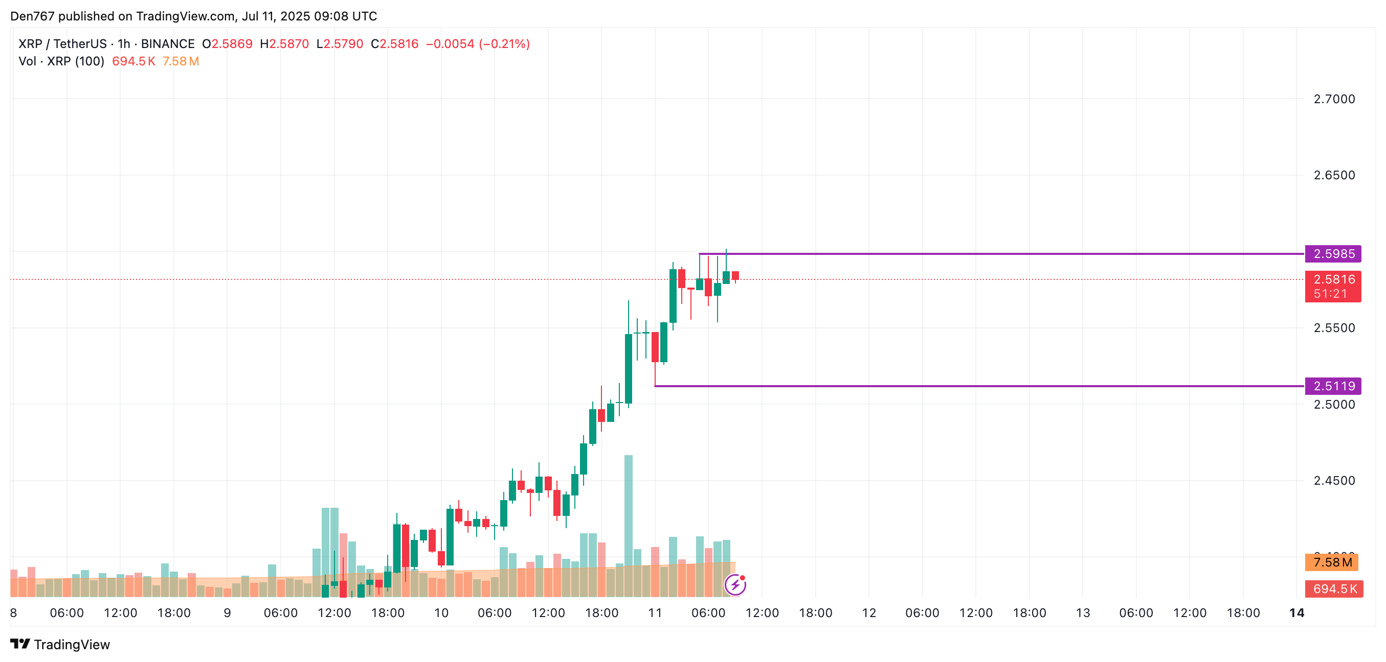 在小时图上,XRP价格正逼近2.5985美元的局部阻力位。若多头能将优势保持至今日收盘,明日或将测试2.60美元关口。