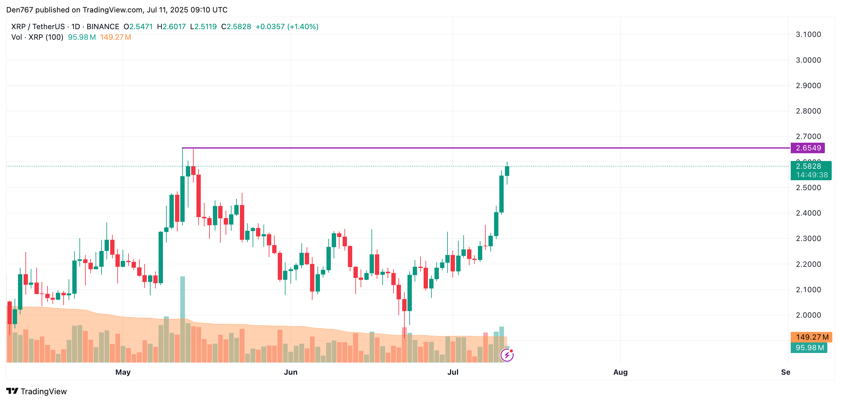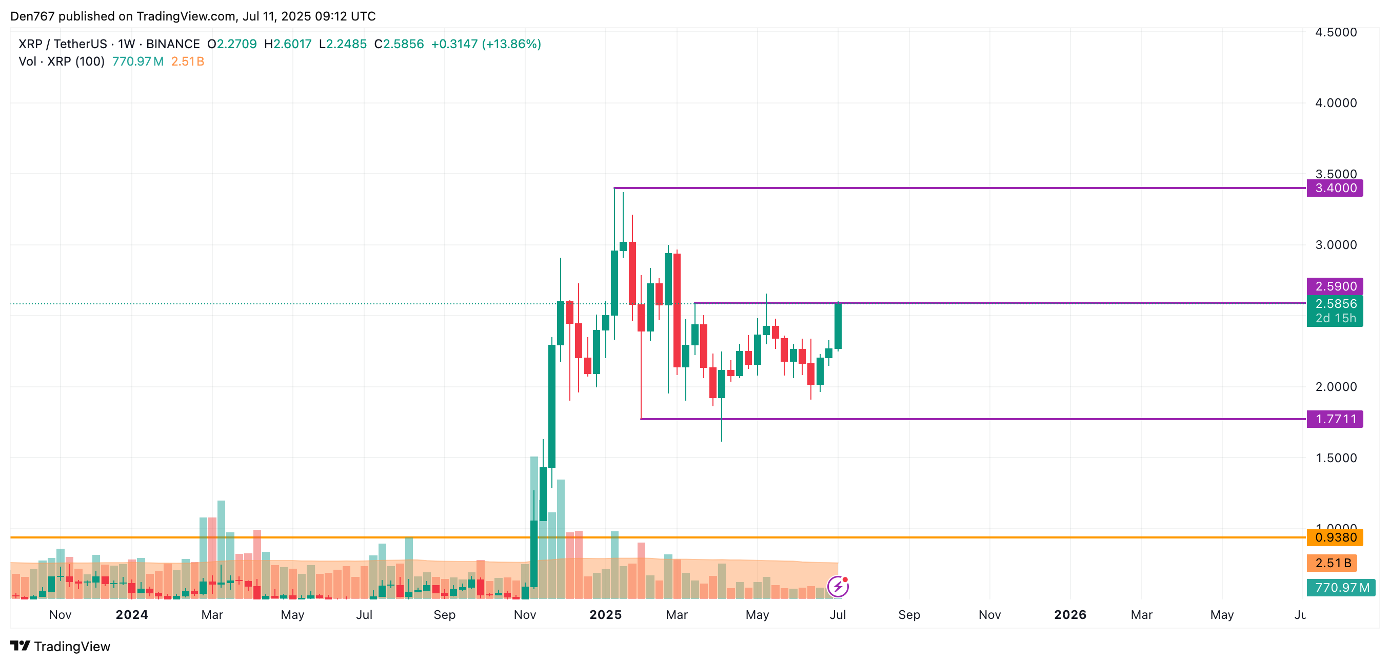 中期来看,XRP价格正在测试2.59美元水平。交易者当前需重点关注周线收盘情况——若能在阻力位上方完成收盘且无明显长影线,积累的能量或足以推动价格冲击2.70-2.80美元区间。