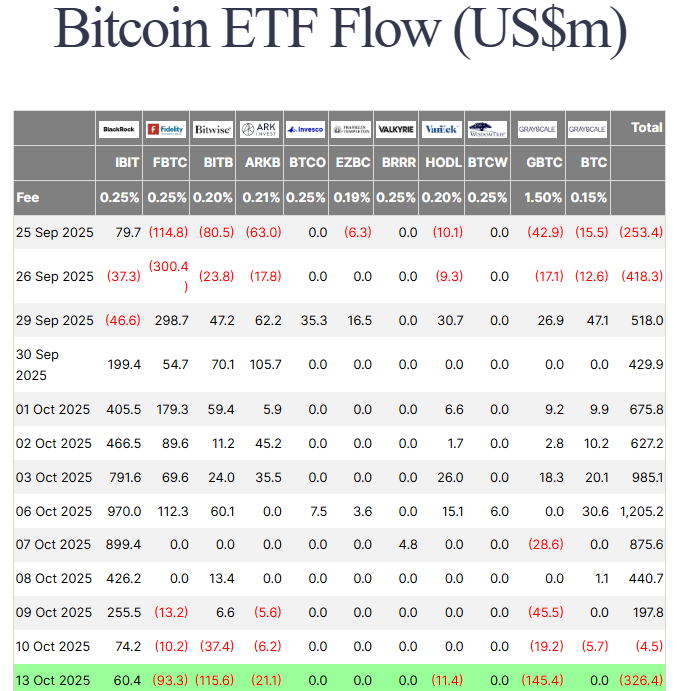 比特币价格下跌的主因或是主力机构兴趣减弱。Farside Investors数据显示,美国现货比特币ETF周一资金流出超3.26亿美元,创近11天最高纪录。灰度GBTC单日流出1.45亿美元居首。尽管10月13日BTC价格反弹,但ETF资金自上周五起持续外流,当时流出规模为450万美元。