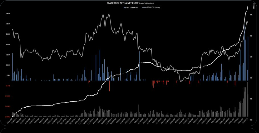 机构对以太坊的兴趣远不止于个人钱包。7月22日,贝莱德旗下以太坊ETF(代码:ETHA)净流入115,295枚ETH,相当于4.262亿美元。