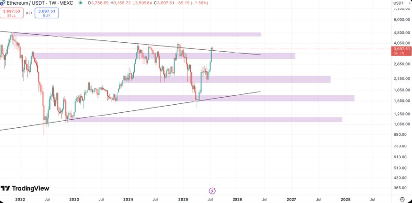 在此背景下,ETH/USDT周线图显示以太坊价格正接近约3700美元的关键阻力位。该位置长期作为对称三角形形态的上沿。