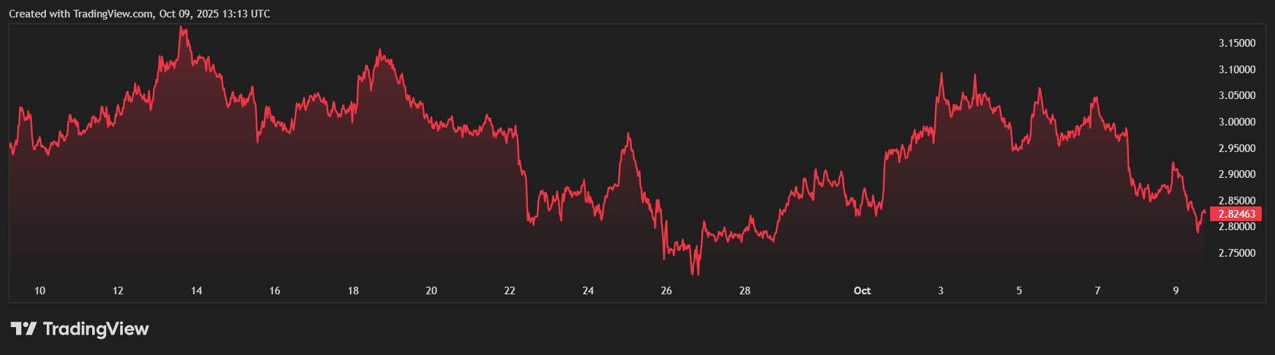 XRP当前交易价格约为2.81美元,维持在数月高点附近。技术分析显示3.10至3.25美元区间存在关键阻力位,该区域历来是早期持有者获利了结的抛售区。2.25-2.30美元区间则构成短期回调支撑位。