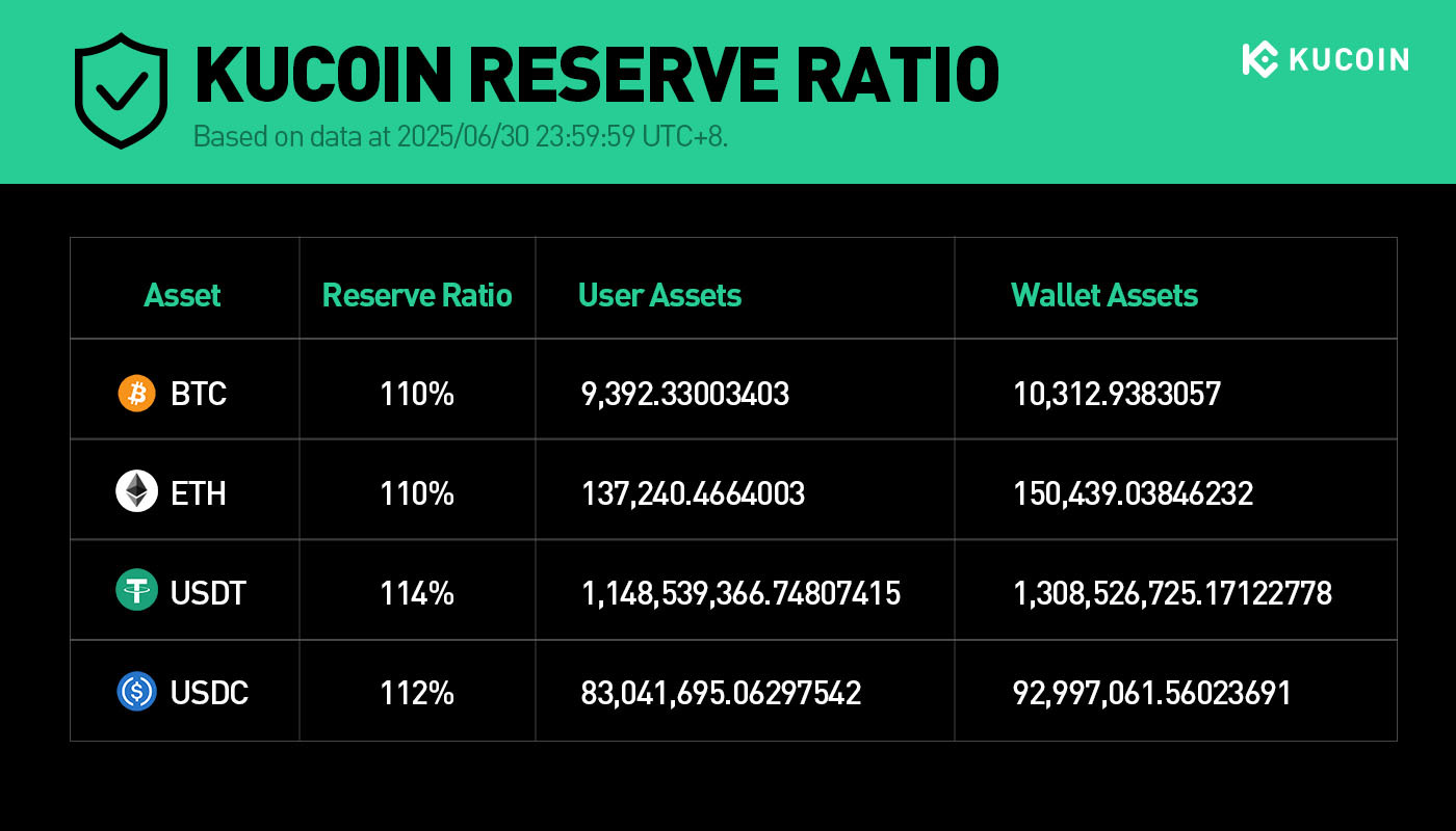 审计结果显示,用户持有的主要加密货币余额均得到全额担保。截至2025年6月30日库币PoR仪表板显示的验证储备比例如下: