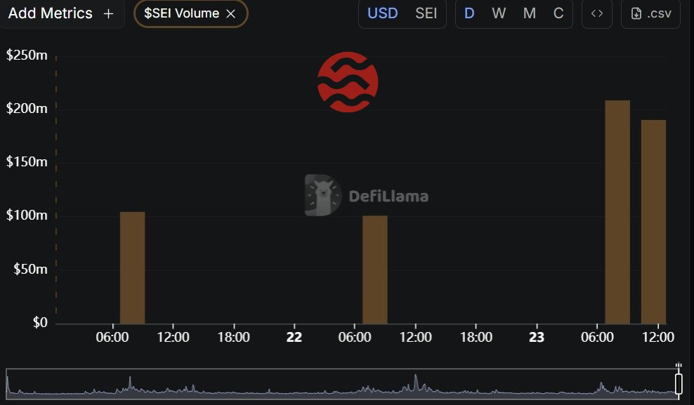 推动$SEI乐观情绪的另一个关键因素是交易量的戏剧性增长。DeFiLlama数据显示,过去24小时内$SEI交易量翻倍,尤其在9月22日至23日出现显著峰值。