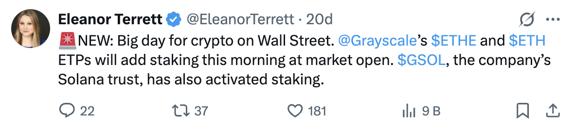 灰度公司今日宣布,随着华尔街市场开盘,其基于以太坊的ETHE和ETH交易所交易产品(ETP)正式启动质押功能。同时,该公司的Solana信托产品GSOL也将同步激活质押服务。这一进展为美国投资者提供了通过现货加密货币ETP直接获取质押收益的机会。此前发布的官方公告已确认ETP产品质押机制的应用,该消息经福克斯商业记者Eleanor Terrett核实。
