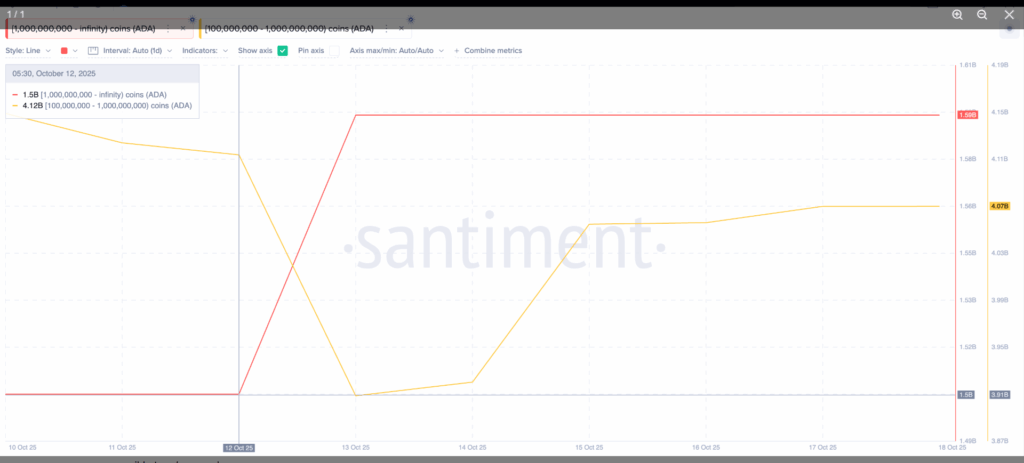 尽管遭遇部分巨鲸抛售(10月8-14日累计卖出3.5亿枚导致价格下跌15%),但另两组巨鲸合计买入2.5亿枚$ADA(价值1.5亿美元)。Chaikin资金流指标显示散户跟风买入迹象。