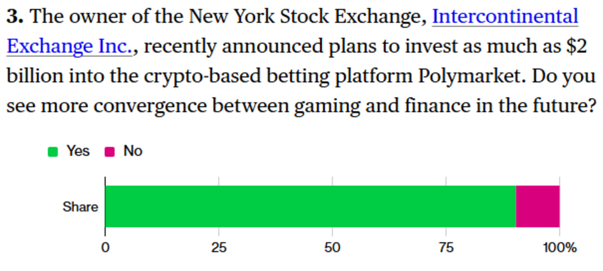 纽约证券交易所母公司洲际交易所上月宣布向Polymarket投资高达20亿美元。当被问及是否预期游戏与金融未来会更深度融合时,约90%的受访者给出了肯定答复。
