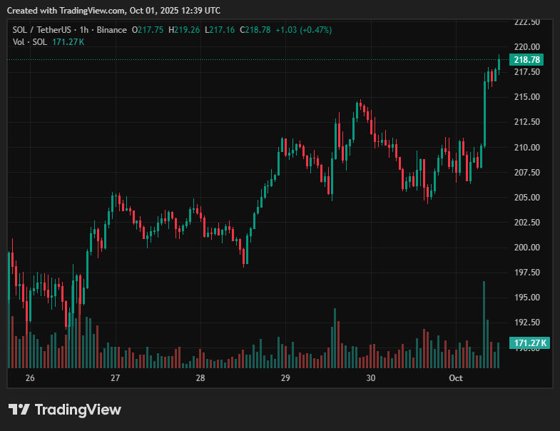 尽管短期走势乐观,但255美元阻力位仍是决定中长期趋势延续的关键节点。最新交易时段中,Solana维持215美元上方震荡并收于218.78美元,其上涨动能强劲,短时间内买盘激增推动价格持续走高。当前市场焦点转向Solana能否突破220-225美元关键区域。