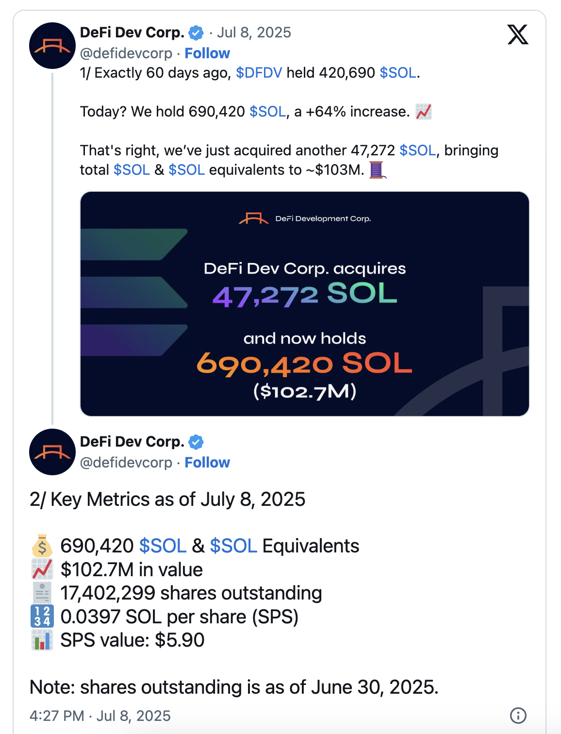 DeFi Development近期通过战略性收购扩大了其以Solana为重点的国库模型。7月8日,该公司增持了47,272枚SOL,使其总持仓量达到690,420枚。这笔价值约703万美元的收购,标志着其Solana资产在过去两个月内实现了64%的增长。新增的SOL将被质押,突显了该公司对可持续利润的追求。该交易重新点燃了Solana网络价格上涨的预期,而机构投资者对该网络的兴趣正在快速增长。