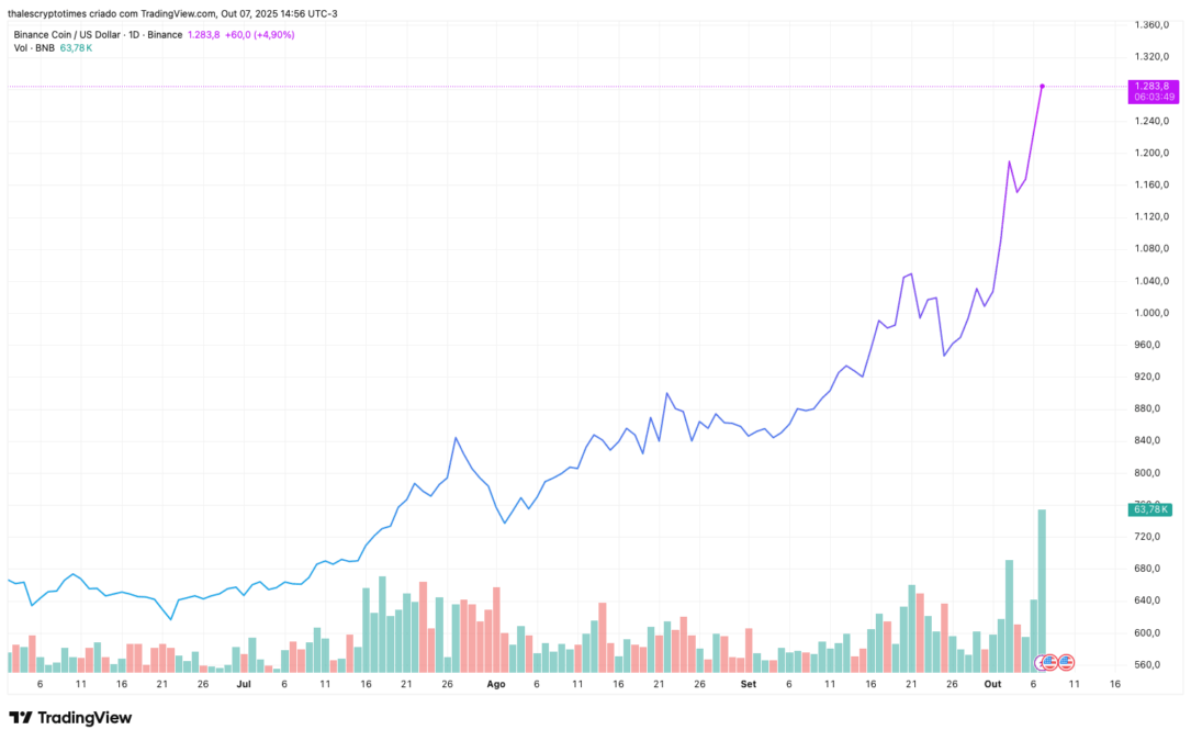 与此同时,BNB本体价格突破1300美元大关,单日暴涨7.5%,市值超越XRP和USDT跃居加密货币第三位。分析师指出,持续的资金流入、强劲的衍生品头寸及网络升级等基本面因素,暗示当前涨势可能超越短期炒作周期。