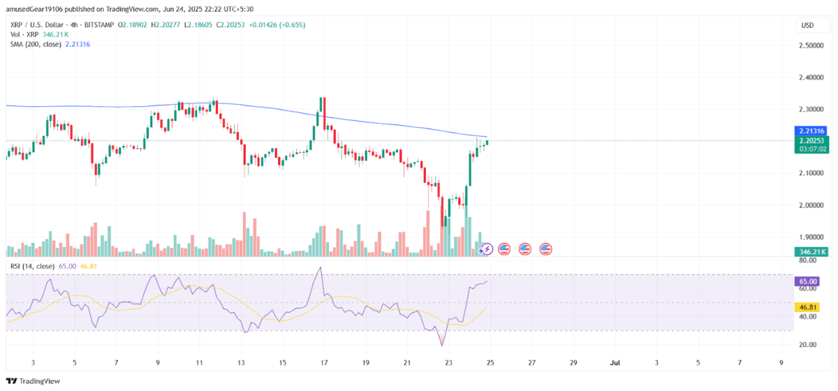 当前XRP交易价格为2.18美元,总体仍保持8.5%的涨幅。4小时图表显示XRP即将测试200日均线,若在代币解锁前能突破该点位,可能成为后续抛压的支撑位。RSI指标接近65,显示持续动能但已接近超买区域。