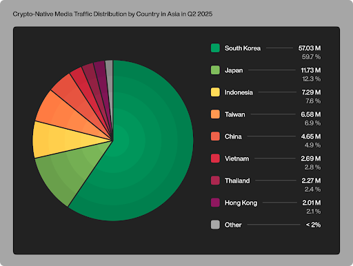 亚洲加密原生生态系统在第二季度即达成9562万次访问,其中韩国以5703万次访问遥遥领先,日本以1173万次紧随其后。这些数据凸显了在本地化报道至关重要的市场中,本土平台的优势地位。