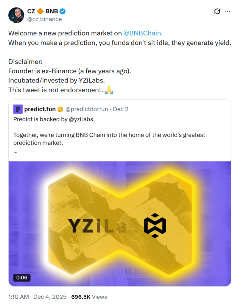 币安创始人赵长鹏(CZ)本周通过分享BNB链预测市场的新进展引发关注。他重点介绍了由前币安团队成员开发的predict.fun平台,该平台允许用户在持有未平仓头寸的同时获得收益。