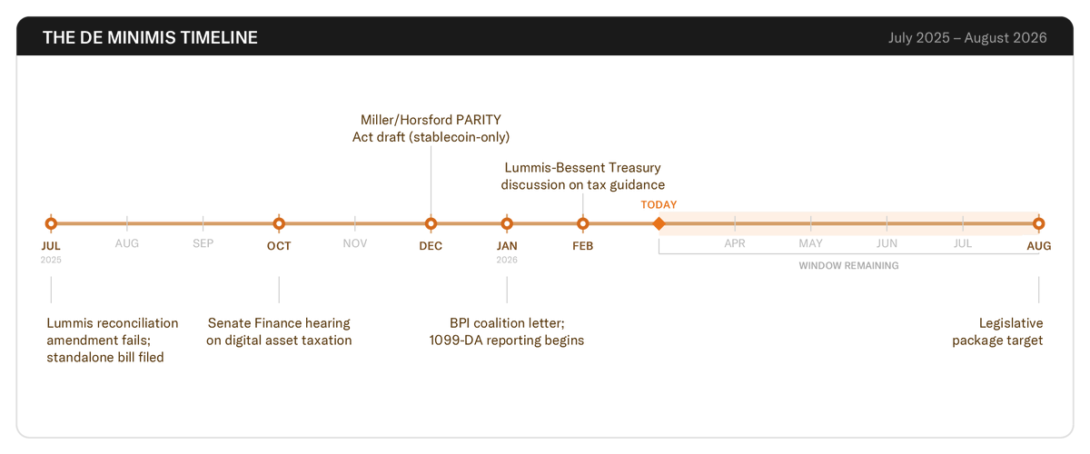 比特币政策研究所警告称,立法者实际上必须在2026年8月之前通过有意义的立法,为小额数字资产支付引入最低限度税收豁免。如果没有这样的豁免,根据美国现行税收规则,即使是微小的比特币交易在技术上也会触发资本利得报告要求。