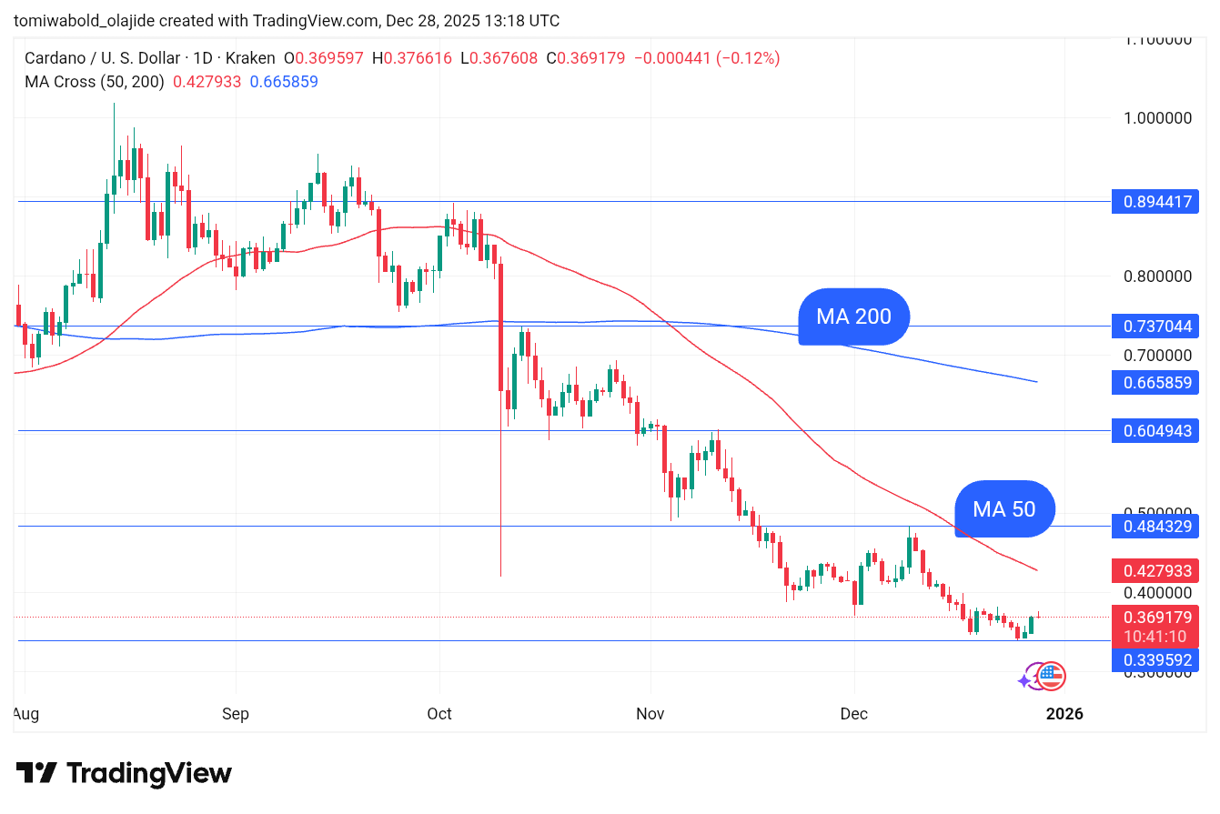 截至撰稿时,ADA报价0.37美元,自12月26日起连续两日上涨后触及日内高点0.376美元。此前在12月23日至25日的节前淡静交易中,因投资者转向避险情绪,卡尔达诺曾经历连续三日的下跌。