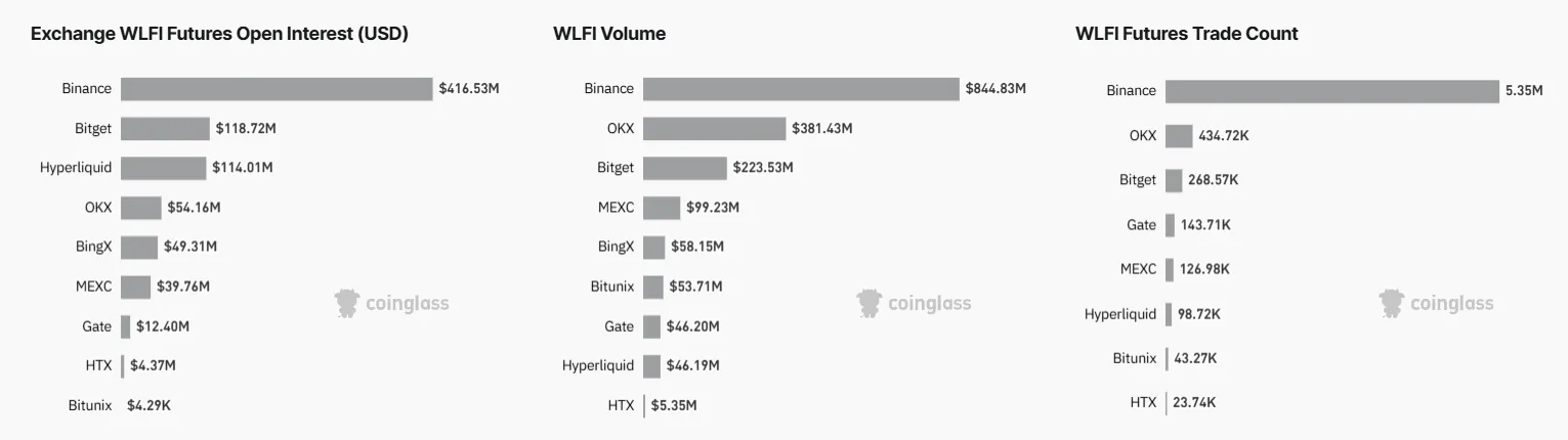 CoinGlass统计显示,过去24小时内WLFI未平仓合约激增68%至8.093亿美元,同期交易量暴涨141%达到17.6亿美元。其中超过50%的交易活动集中在币安平台,其余主要分布在Hyperliquid和Bitget等交易所。