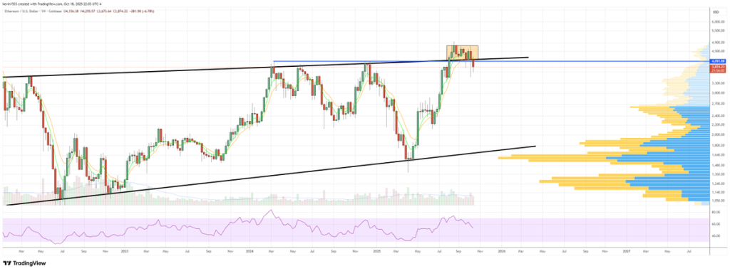 分析师kpak发布的长期图表显示,ETH回落至自2025年初形成的上升楔形内部。此前作为支撑的4050-4100美元区间已然失守,这一转变使ETH重回旧有整理区域。