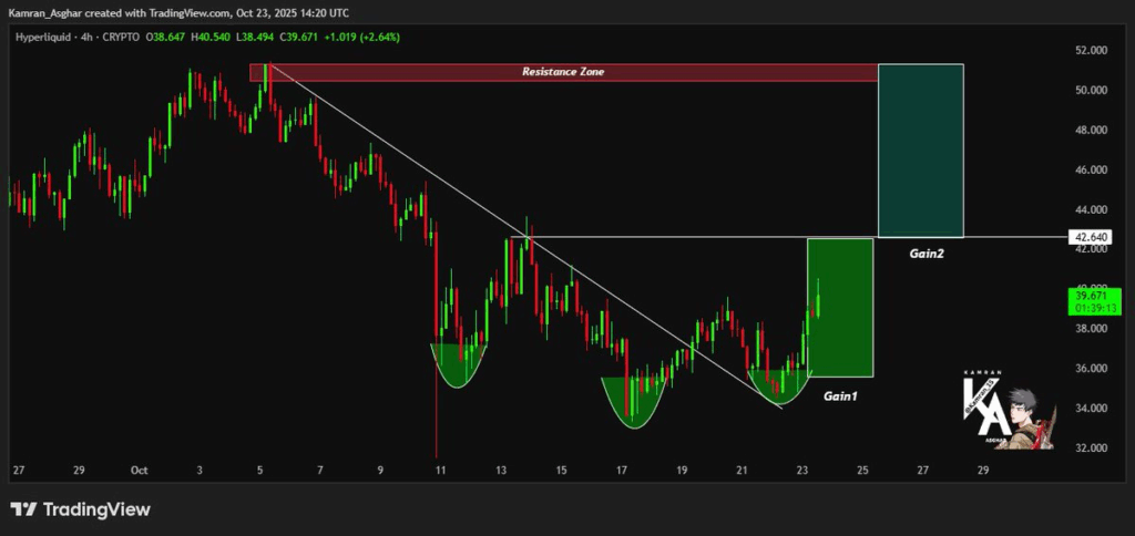 四小时图表清晰显示$HYPE形成头肩底形态,标志着看跌到看涨的动能转换。左肩形成于10月11日35美元附近,随后在10月17日构筑更深的头部低点,右肩则在10月22-23日期间成型,显示买家提前入场强化反转信号。