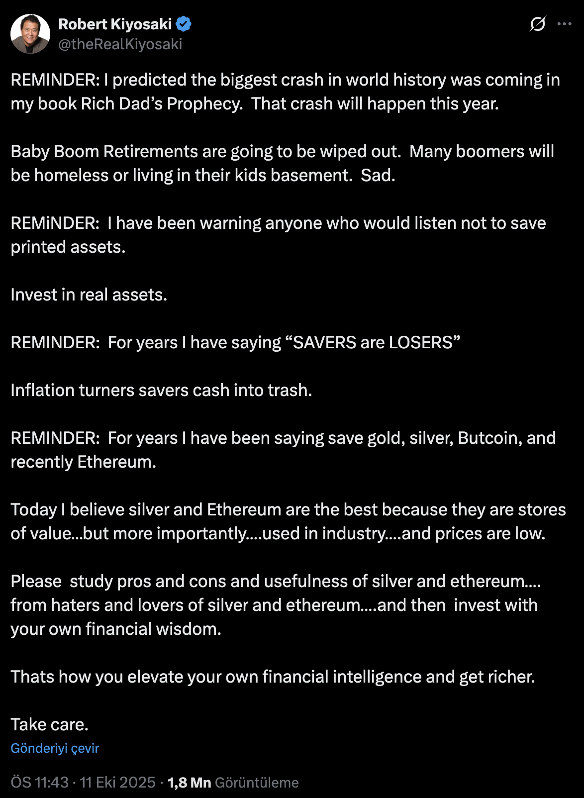在近期一份声明中,因著作《穷爸爸富爸爸》闻名的罗伯特·清崎预测,随着加密货币和股市出现大规模抛售,年内将发生严重的市场崩盘。上周末,他在社交平台X上强调婴儿潮一代的退休金可能面临蒸发风险,并建议投资者转向"真实资产",尤其是白银和以太坊,因其兼具保值功能与工业用途。
