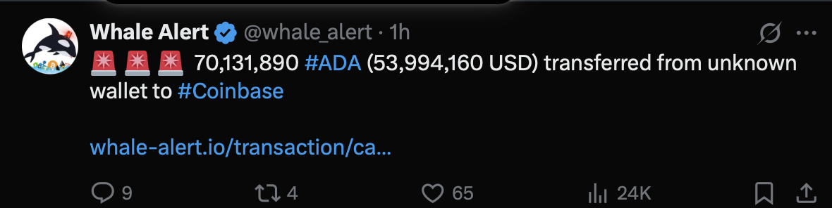 Cardano(ADA)涉及两笔规模几乎相同的转账。其中一笔交易中,7013万枚ADA(价值约5400万美元)从未知钱包转入Coinbase。不久后,6876万枚ADA(价值约5300万美元)从Coinbase转出至未知钱包。这些相反方向的资金流动可能暗示着场外交易(OTC)或交易所内部重新分配。