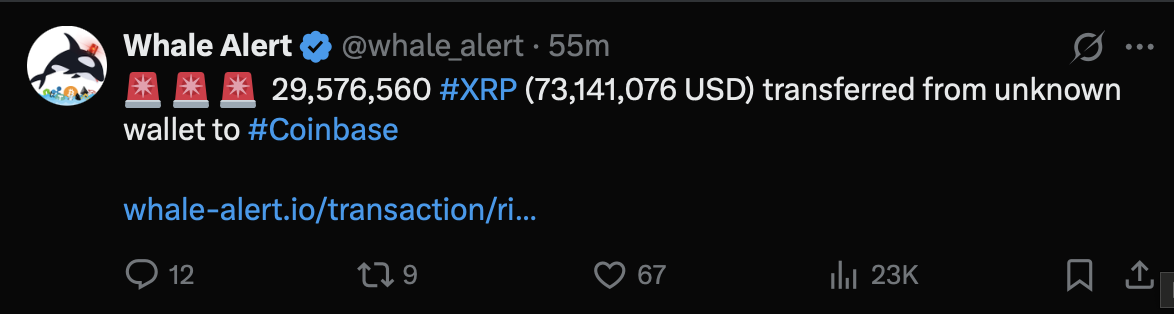 XRP也出现了显著的资金流动。2957万枚XRP(价值约7300万美元)从未知地址转入Coinbase。这种流入交易所的资金通常暗示着潜在的卖压,可能预示着将在公开市场上抛售大量持仓。