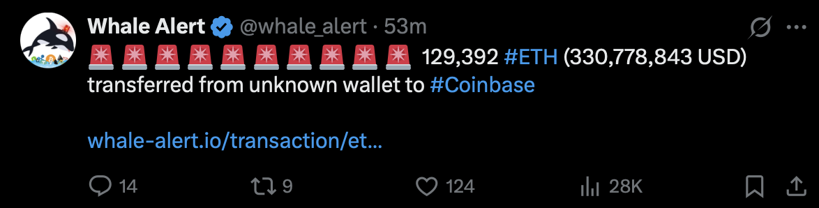 以太坊(ETH)随后出现了大规模资金流入,129,392枚ETH(价值约3.31亿美元)从未知钱包存入Coinbase。这笔转账的规模和方向可能反映出大规模的机构重新定位或为流动性事件做准备。