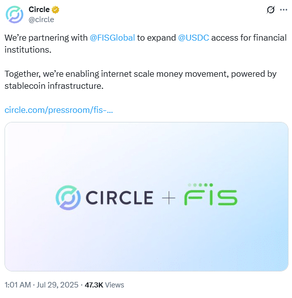 富达国民信息服务公司(FIS)与Circle合作推动银行采用稳定币