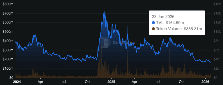 总锁仓价值在2025年初达到近8亿美元峰值后随交易量波动下降,反映出活跃交易期与低量平静期的交替循环。