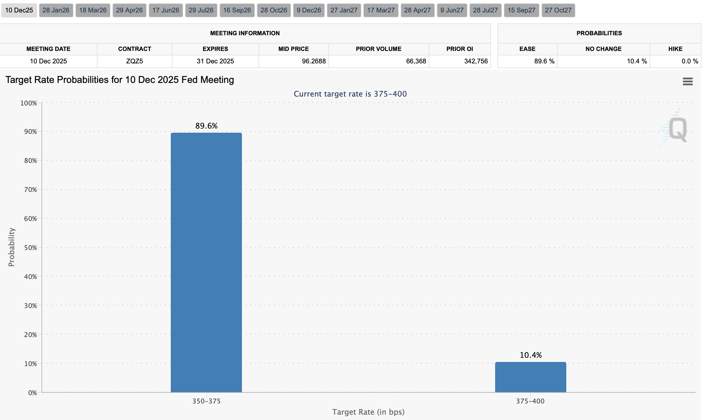 根据期货市场数据,降息25个基点的概率约为90%。由于这一结果已被市场预期数周,交易员预计决议公布时不会引发剧烈反应。