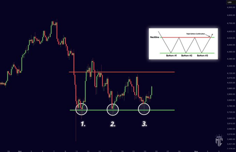 以太坊当前的盘整阶段如同压缩的弹簧,蓄势待发。分析师@MisterCrypto在推文中指出,三重底形态的突破已经完成。若能突破4500美元阻力位,5800-7000美元的目标区间将很快打开,预计2026年初可能重新测试历史高点。