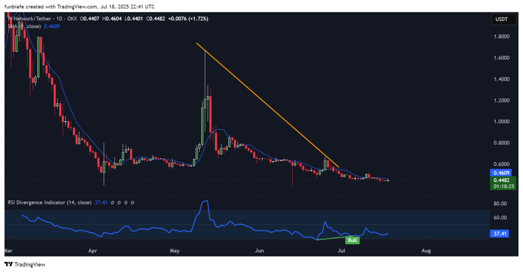 日线图显示Pi币仍处于强劲下跌趋势中。自五月未能突破1.75美元后,价格持续形成更低的高点,呈现缓步阴跌态势。