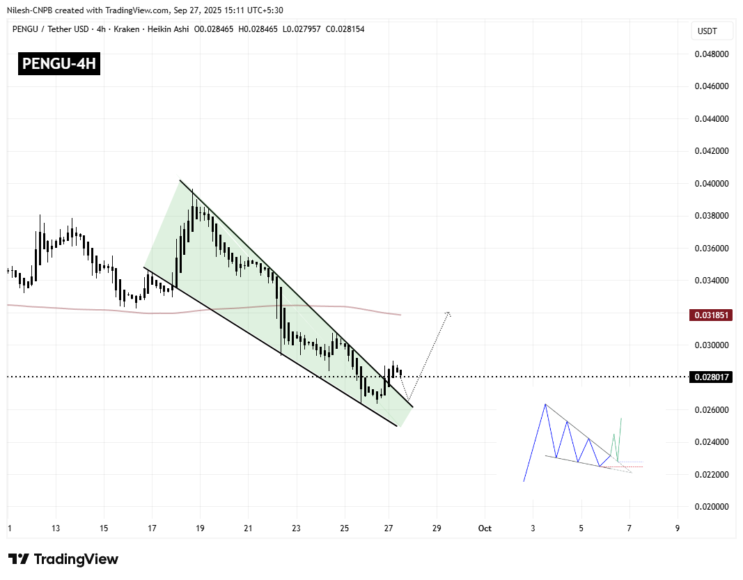 在4小时级别走势中,PENGU确认完成了"下降楔形"突破——这种看涨反转形态通常预示着下跌趋势终结与新上升动能的开始。该楔形结构自9月18日0.03966美元高点形成,价格在逐步走低过程中反复测试趋势线支撑。近期PENGU从0.02633美元反弹并成功突破0.02785美元附近的楔形阻力线,目前最高触及0.029美元,强化了看涨逻辑。