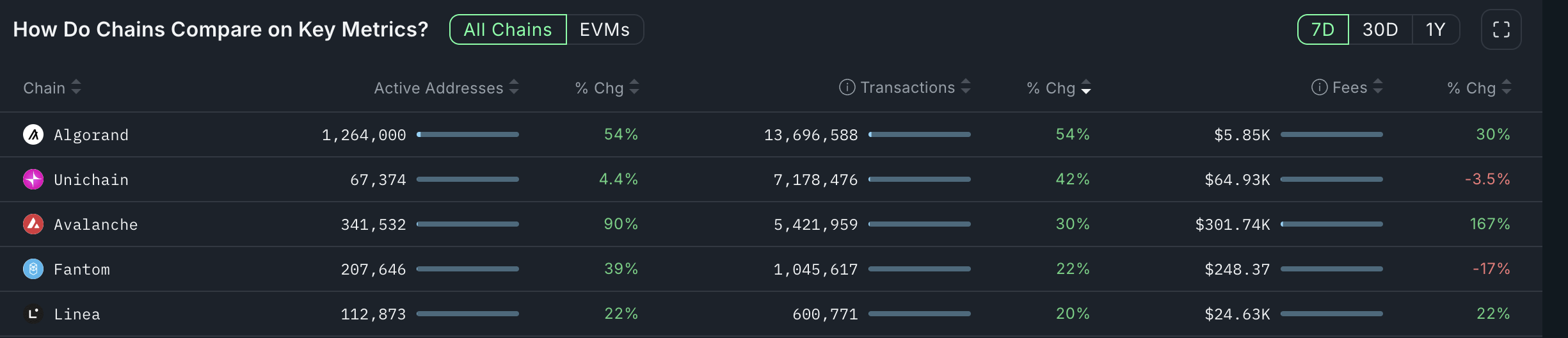南森数据显示,过去七日阿尔戈兰德是加密行业表现最佳的区块链网络。期间该网络处理交易量达1369万笔,周环比增长54%。活跃地址数同样增长54%至126.4万个。