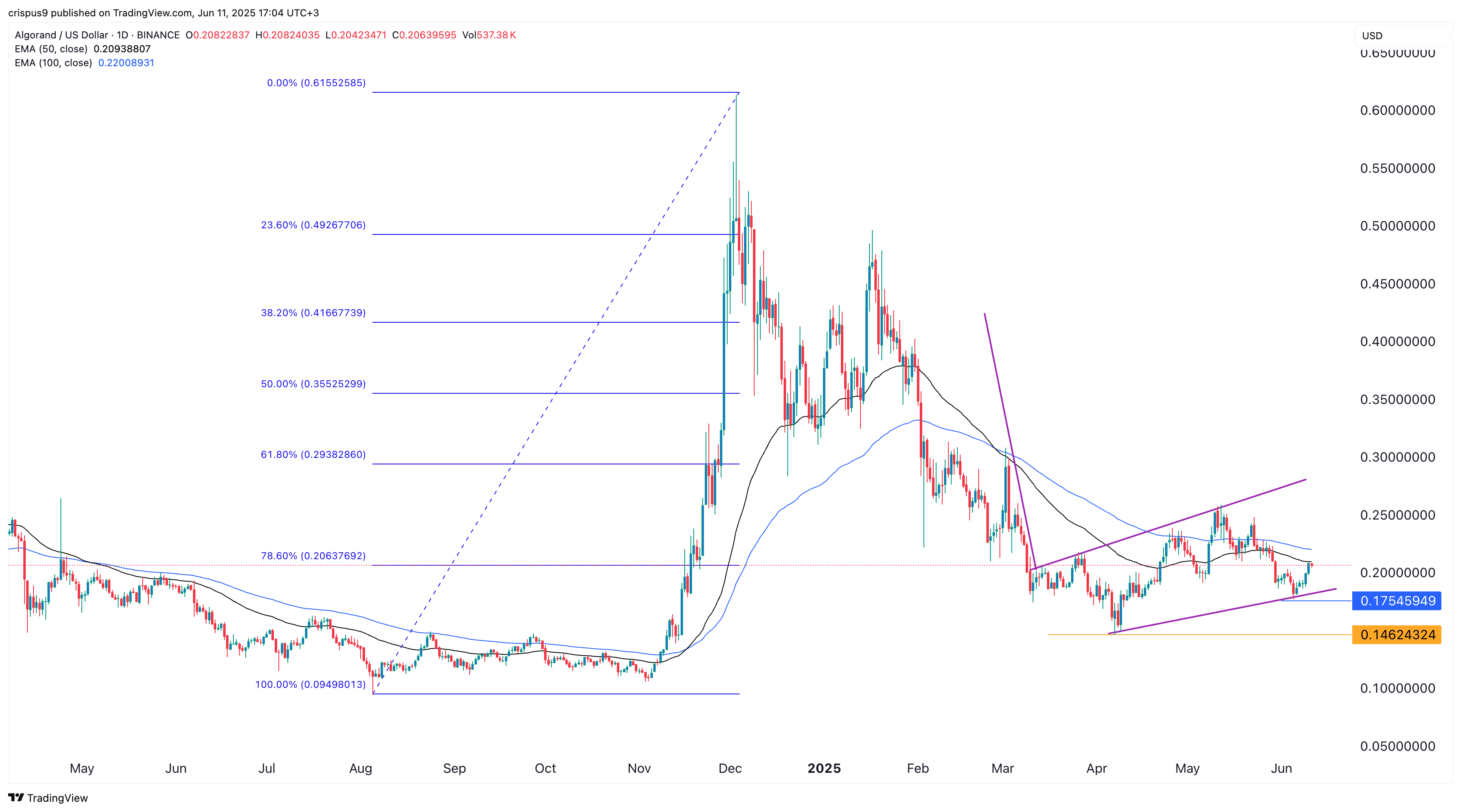 日线图表显示,ALGO价格自4月7日触及0.1462美元低点后持续反弹,形成上升通道。该通道构成看跌旗形形态,通常预示趋势延续。当前价格仍位于50日和100日均线下方,并在0.2083美元(78.6%斐波那契回撤位)附近震荡。